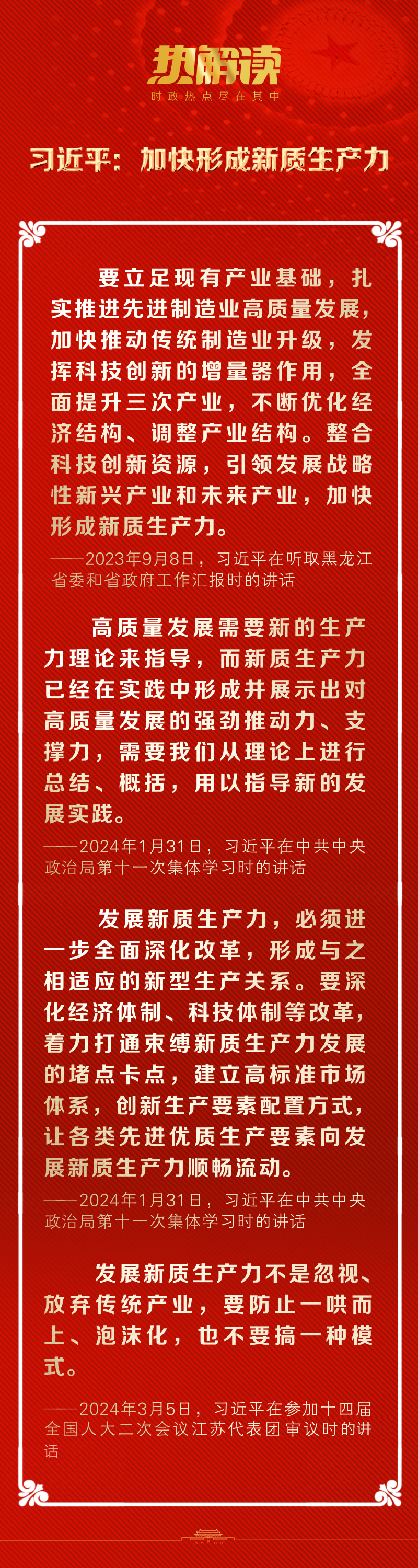 從2023年底召開的中央經(jīng)濟(jì)工作會(huì)議要求發(fā)展新質(zhì)生產(chǎn)力,到今年中央政治局首次集體學(xué)習(xí)時(shí)聚焦“新質(zhì)生產(chǎn)力,再到今年政府工作報(bào)告將加快發(fā)展新質(zhì)生產(chǎn)力列為2024年十大工作任務(wù)之首,一系列重要安排部署釋放出鮮明信號(hào),即發(fā)展新質(zhì)生產(chǎn)力重要且迫切。