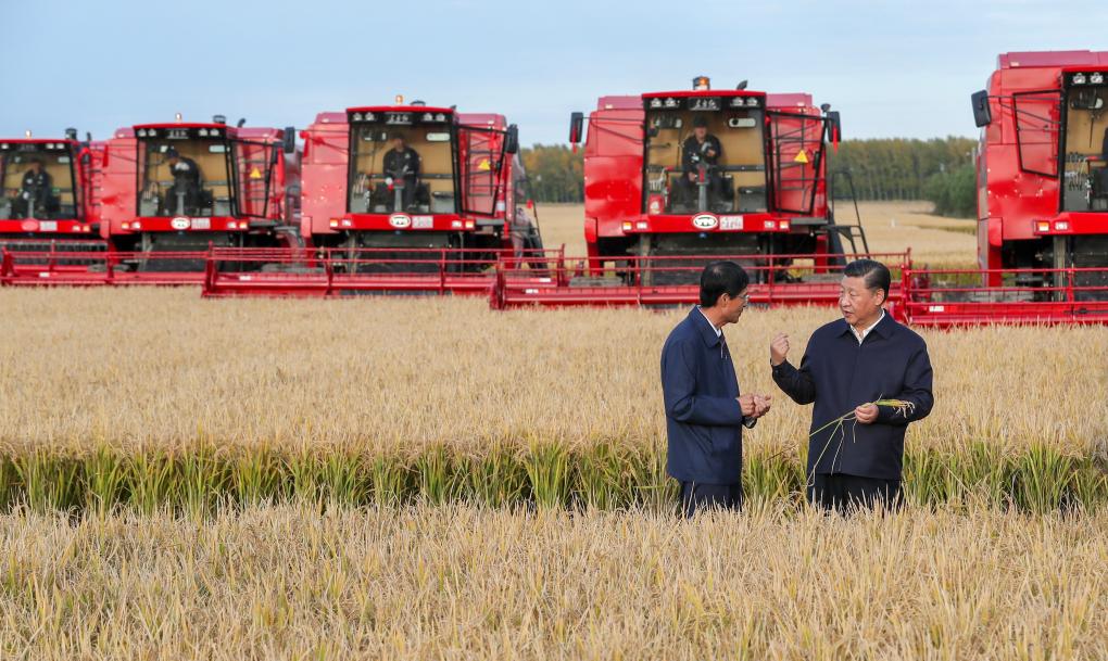 2018年9月25日,金秋時節(jié),稻浪滾滾,黑龍江農墾建三江管理局七星農場萬畝大地號豐收在望。習近平總書記走進正在收割的地塊,拿著稻穗,同工作人員交談,詳細了解糧食生產和收獲情況。