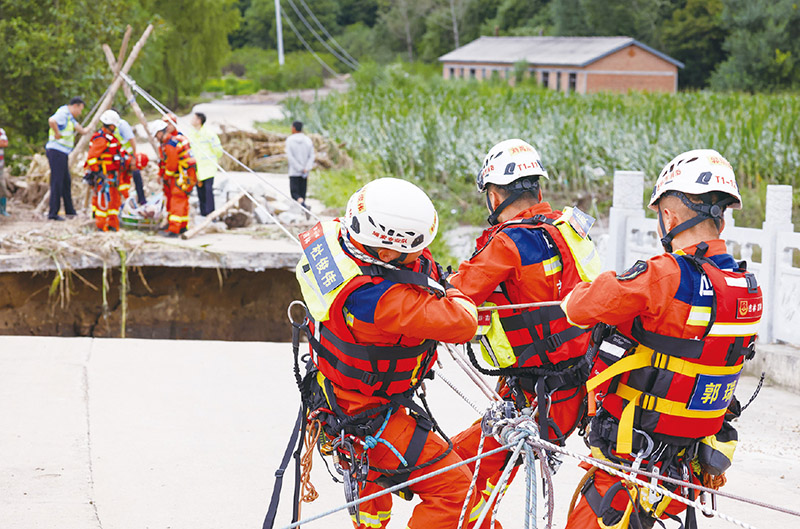 2023年夏,面對(duì)影響華北、黃淮、東北等地的嚴(yán)重汛情,在以習(xí)近平同志為核心的黨中央堅(jiān)強(qiáng)領(lǐng)導(dǎo)下,廣大黨員干部為守護(hù)人民生命和財(cái)產(chǎn)安全挺身向前,千千萬萬人民群眾為保衛(wèi)家園頑強(qiáng)奮戰(zhàn)。圖為8月6日,吉林省吉林市消防救援支隊(duì)隊(duì)員利用繩橋解救受困村民。 新華社記者 顏麟蘊(yùn)/攝