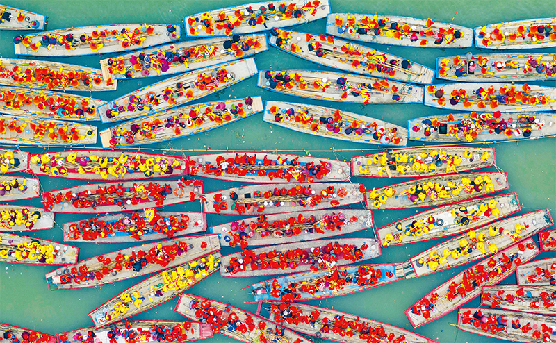 溱潼會(huì)船由南宋相沿至今,歷經(jīng)數(shù)百年傳承,被列入國(guó)家級(jí)非物質(zhì)文化遺產(chǎn)名錄。圖為2024年4月6日在江蘇省泰州市姜堰區(qū)溱湖國(guó)家濕地公園參加會(huì)船表演的船只。 新華社發(fā) 湯德宏/攝