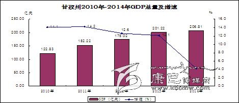 2014年,全州地區(qū)生產(chǎn)總值(GDP)達(dá)到206.81億元,按可比價(jià)格計(jì)算較2013年增長4.2%。其中,第一產(chǎn)業(yè)增加值51.48億元,增長4.6%;第二產(chǎn)業(yè)增加值77.20億元,增長2.4%;第三產(chǎn)業(yè)增加值78.13億元,增長6%。三次產(chǎn)業(yè)結(jié)構(gòu)為24.9:37.3:37.8。