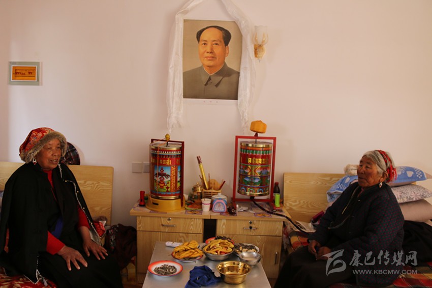 從餐廳出來(lái),記者走進(jìn)了一間15平方米左右的宿舍。兩位老人正坐在各自的木床上看電視,墻上掛著的液晶電視是連著機(jī)頂盒的。兩床之間,放著藏桌和床頭柜,藏桌上有瓜子、花生、酥油果子、牛肉等食品,亞瑪翁青老人熱情地說(shuō):“因?yàn)檎谶^(guò)藏歷新年,這些都是福利院為我們備的年貨,你也嘗嘗!”。房間里最引人注目的便是掛在床頭柜上方的系著哈達(dá)的毛主席畫(huà)像,兩位老人指著毛主席畫(huà)像動(dòng)情地說(shuō):“毛主席、共產(chǎn)黨是我們的恩人,看著他的畫(huà)像我們安心?!贝送猓块g里還有衣柜、配有馬桶的獨(dú)立廁所和盥洗臺(tái),毛巾、漱口盅、掃把、拖把都整齊地放在對(duì)應(yīng)位置。亞瑪翁青笑著說(shuō):“我們住的房間都趕得上縣城里的賓館了?!?/span>