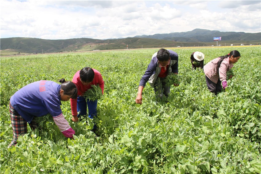 理塘圣地農(nóng)莊工人采摘豌豆尖。