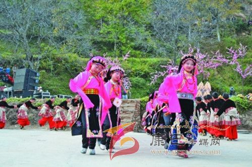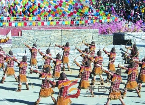 10月26日,在甲居藏寨,處處洋溢著豐收和歡樂的氣氛,人們扶老攜幼,身著節(jié)日的盛裝走到一起,來(lái)共同慶祝丹巴嘉絨風(fēng)情節(jié)的順利召開。在一塊空地中,搭建了臨時(shí)的舞臺(tái),看臺(tái)上,幾座古碉模型傲然挺立,在不遠(yuǎn)處,一座古碉矗立在一座小山包上,與古碉模型遙相呼應(yīng)、相映成趣。上午9時(shí)40分,當(dāng)節(jié)目主持人宣布嘉絨風(fēng)情節(jié)正式開始時(shí),一束束搖曳的煙花向空中飛去,在空中炸響后,散發(fā)出五顏六色的煙霧,其中有的還幻化成幾多小小的降落傘,就像多多盛開的鮮花在空中綻放。演出現(xiàn)場(chǎng)前的大地和遠(yuǎn)處的小山坡上到處都站滿了熱情的觀眾,合著禮花的爆裂時(shí)的響聲,將手中的小紅旗展開,高舉過(guò)頭頂,有節(jié)奏的左右搖動(dòng),霎時(shí)間,整個(gè)現(xiàn)場(chǎng)成為了紅色的海洋。