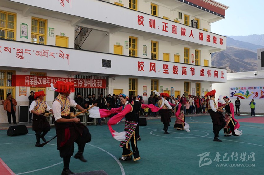 上午11點(diǎn),歡快的音樂在小學(xué)操場(chǎng)上響起,演出正式開始。村民們圍坐在操場(chǎng)上,人頭攢動(dòng)、彩幡飛舞、陽光正好。13個(gè)節(jié)目依次上演,包括男女群舞、女子群舞、男子合唱、女子合唱、男女獨(dú)唱,最有特色的是得榮本地特色群舞《雪域鍋莊》和《九步情》。