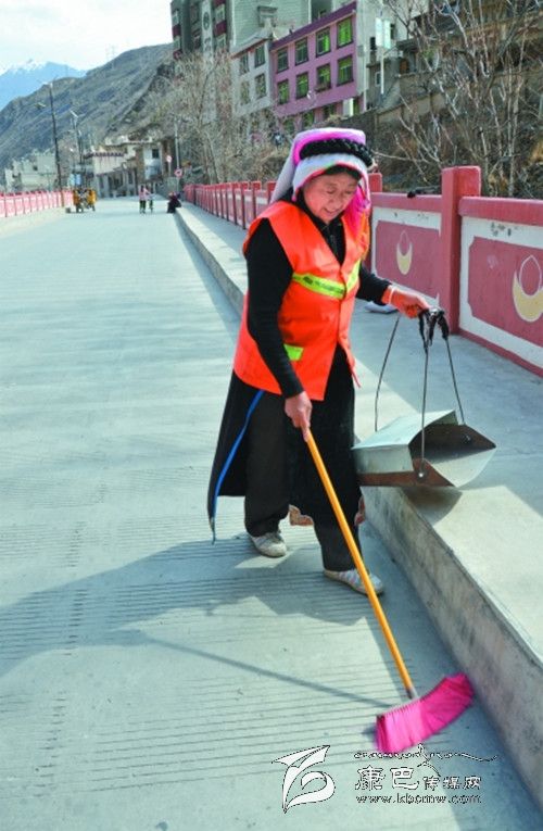 仁青志瑪,50余歲,來(lái)自丹巴縣一座偏僻的小山村。2012年4月,仁青志瑪從老家來(lái)到丹巴縣章古鎮(zhèn)當(dāng)了一名環(huán)衛(wèi)工人,當(dāng)時(shí)每月工資只有800元,除了國(guó)家法定假日能得到雙倍工資外,從來(lái)沒(méi)有星期天。她負(fù)責(zé)的衛(wèi)生區(qū)域在丹巴縣城濱河路上,全長(zhǎng)500余米,由于過(guò)往車輛多,而且行人較多,每天要產(chǎn)生許多垃圾,因此打掃衛(wèi)生的難度極大,為了給過(guò)往的車輛及行人留下好的印象,仁青志瑪大姐每天在這500余米的路上來(lái)來(lái)回回的要掃很多遍。