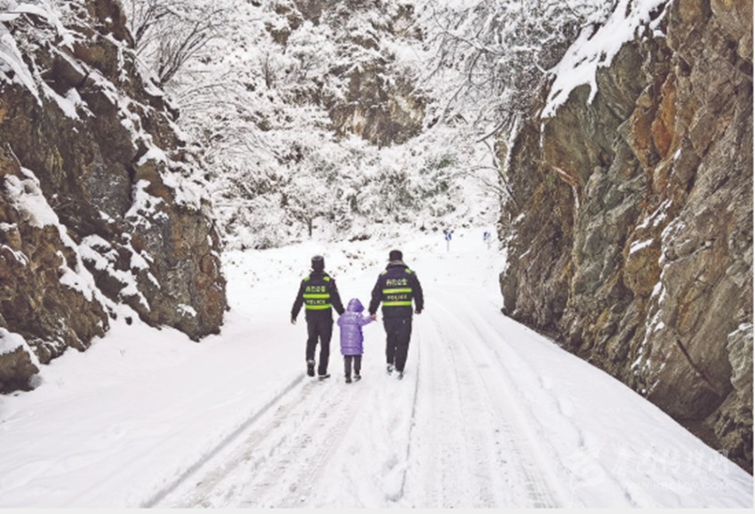 晨間,山谷滿是積雪,氣溫已降至零下??吹巾旓L冒雪如期而至的民警,原本又驚又怕的受困游客看到了希望。柯金貴和戰(zhàn)友們一方面安撫他們,另一方面合力將事故車輛移開,并帶領(lǐng)受困人員安全離開事發(fā)區(qū)域。