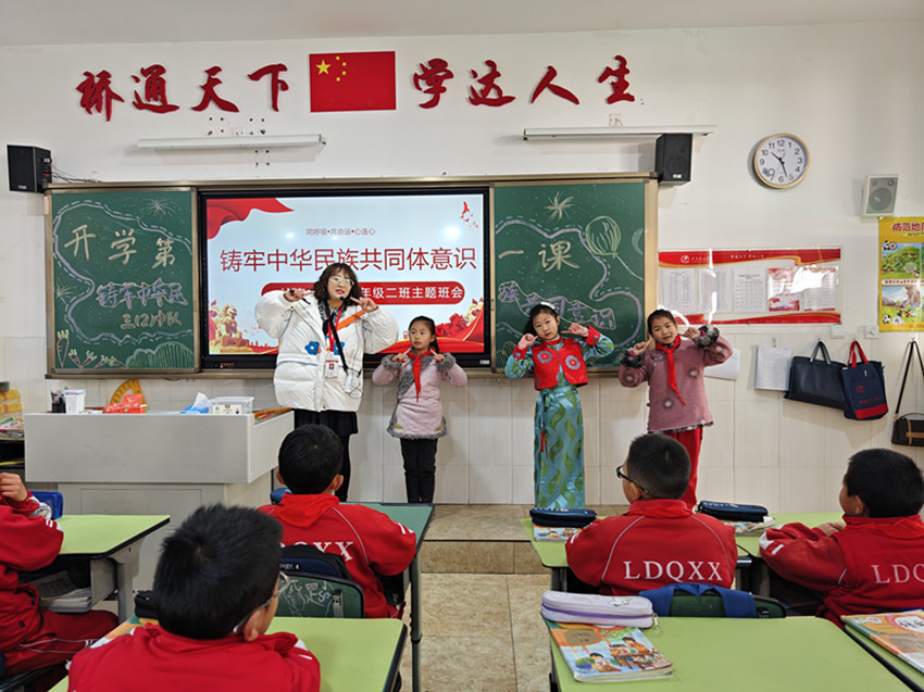 “同學(xué)們,新學(xué)期新起點,沐浴著紅城綠谷春的氣息,我們定要同努力、共奮進(jìn),健康成長,揚眉‘兔’氣!”典禮一結(jié)束,學(xué)生回到教室后,各班班主任便結(jié)合班級情況,開展以“鑄牢中華民族共同體意識”為主題的“開學(xué)第一課”班會活動。