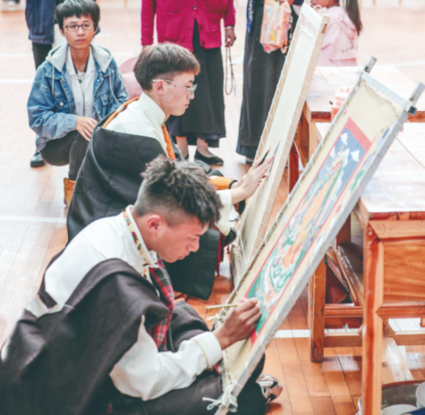 曲久澤仁是郎卡杰畫(huà)派的第九代傳人,也是省級(jí)非遺傳承人。他一直在爐霍縣郎卡杰唐卡實(shí)訓(xùn)基地傳授郎卡杰唐卡技藝。該基地是成都市錦江區(qū)投入援建資金1000余萬(wàn)元的對(duì)口幫扶項(xiàng)目,于2017年投入使用?;孛赓M(fèi)招收貧困學(xué)員學(xué)習(xí)唐卡技藝。經(jīng)過(guò)多年發(fā)展,學(xué)?,F(xiàn)有教職員工16人,畢業(yè)學(xué)員達(dá)280余人。這些學(xué)員年均收入5萬(wàn)元左右,實(shí)現(xiàn)了“學(xué)會(huì)一技、就業(yè)一人、致富一家”的目標(biāo),保護(hù)非物質(zhì)文化遺產(chǎn),弘揚(yáng)了傳統(tǒng)文化,助力爐霍鄉(xiāng)村振興。