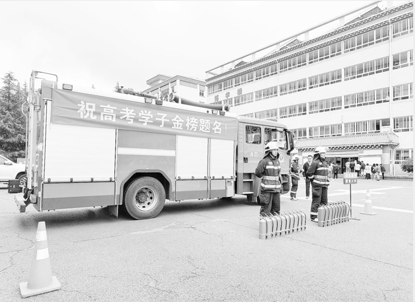 圖為消防隊員為高考保駕護航。