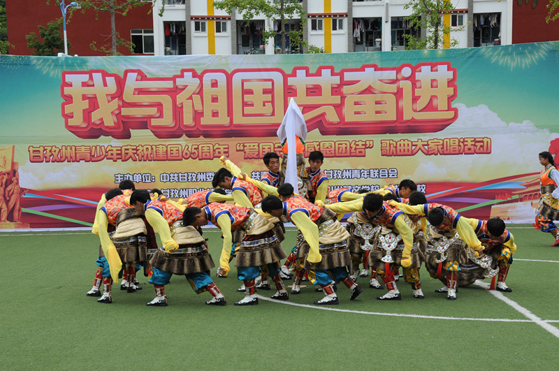 活動中,同學們先后演唱了《黃河頌》、《我愛您,中國!》、《夢圓中國》等多首紅色經(jīng)典歌曲。你方唱罷我登場,現(xiàn)場氣氛熱烈,高潮迭起。優(yōu)美的歌聲唱出了我青少年的愛國情懷,一面面飄揚的紅旗表達著對祖國的深情祝福。來自州職業(yè)技術(shù)學校、四川民族學院、省藏校、甘孜衛(wèi)校、州青聯(lián)委員以及我州著名歌手共1000多人放聲高歌,共同慶祝新中國成立65周年華誕。