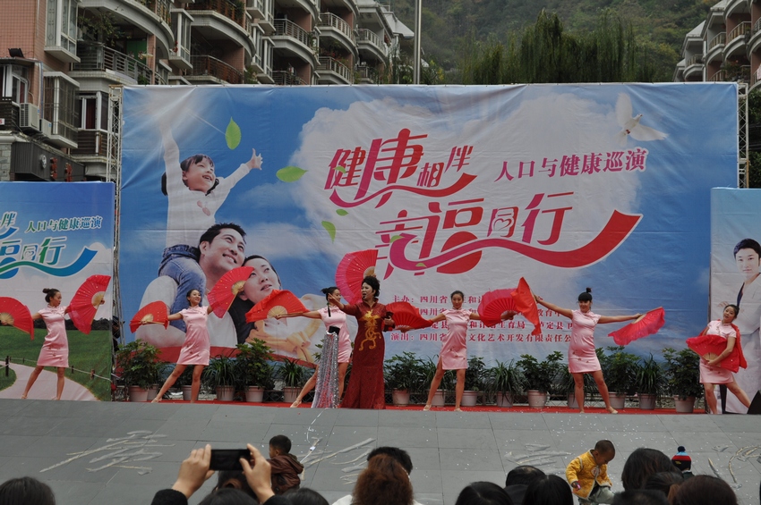 舞臺上“健康相伴•幸福同行”大型演出背景格外醒目,由省虹宇藝術(shù)團自編自演的舞蹈《歌舞青春》、金錢板《怪哪個》、小品《你生不生》、四川清音《分級診療就是好》、雜技《烏依人》、戲曲《天府奇葩》等節(jié)目陸續(xù)登場。演員們通過戲曲、歌曲等形式,向廣大觀眾傳播衛(wèi)生計生新政策,臺下各縣屬醫(yī)療衛(wèi)生計生機構(gòu)醫(yī)務(wù)人員免費開展義診活動,為廣大群眾查血壓、詢問病史、咨詢等忙個不停,群眾與演員互動場面感人。演出活動取得良好的教育效果,得到廣大群眾的熱烈歡迎。