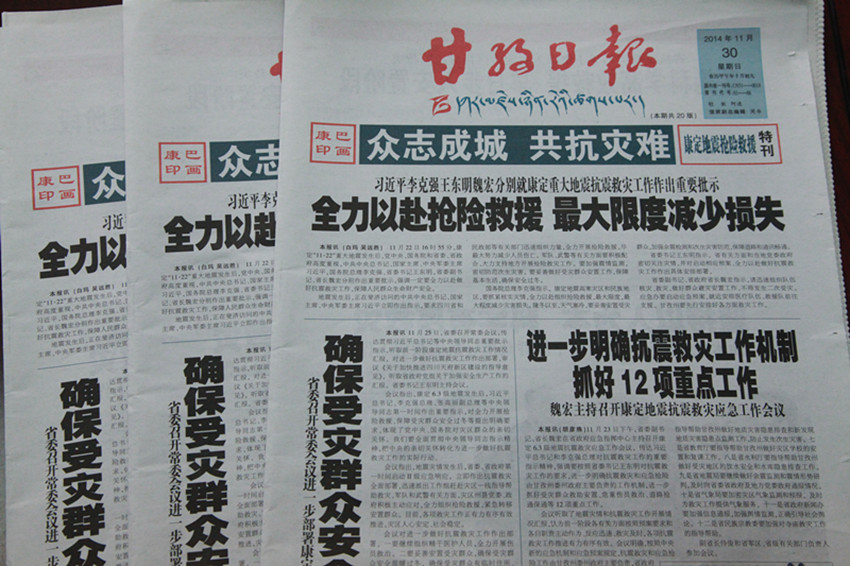 又訊 此外,自康定地震發(fā)生以來(lái),本報(bào)藏漢文報(bào)廣大編采人員發(fā)揚(yáng)連續(xù)作戰(zhàn)的精神,已經(jīng)連續(xù)9天不分白天黑夜地工作,保證了一線(xiàn)有記者的身影,后方編輯及時(shí)發(fā)聲,截止30日,本報(bào)藏漢文報(bào)已經(jīng)出版13期《眾志成城 共抗災(zāi)難》專(zhuān)刊和一期特刊,共計(jì)72個(gè)版面;本報(bào)《康巴傳媒網(wǎng)》自開(kāi)辦網(wǎng)站以來(lái),首次實(shí)現(xiàn)了網(wǎng)站信息即時(shí)更新、滾動(dòng)發(fā)布,網(wǎng)站日上稿量超過(guò)100條,日點(diǎn)擊量均超過(guò)10萬(wàn)人次;本報(bào)微信平臺(tái)則采用短平快的方式,第一時(shí)間發(fā)布最新資訊,引導(dǎo)公眾情緒,傳播黨委政府的聲音,微信日點(diǎn)擊和轉(zhuǎn)發(fā)量超過(guò)2萬(wàn)人次;除此之外,本報(bào)承辦的手機(jī)報(bào)也發(fā)揮了巨大的作用。