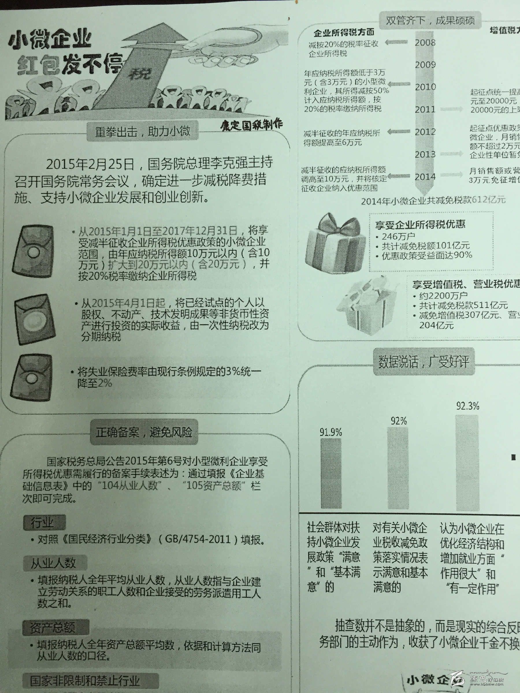 九龍縣國稅局倡導(dǎo)稅務(wù)人員和納稅人代表組建“小微企業(yè)納稅服務(wù)志愿小分隊(duì)”,大力宣傳落實(shí)小微企業(yè)稅收優(yōu)惠政策,使該局享受小微企業(yè)稅收優(yōu)惠政策的納稅人從124戶增加至133戶,享受面達(dá)到100%。