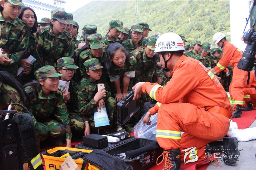 本網(wǎng)訊(龍培民)8月26日,州消防支隊(duì)首次在康定中學(xué)舉辦“消防進(jìn)軍訓(xùn)”實(shí)踐操課演練活動(dòng)。通過支隊(duì)官兵的講解和演示,康定中學(xué)正在參加軍訓(xùn)的1000余名高一新生對(duì)消防安全工作有了進(jìn)一步的了解和認(rèn)識(shí),并通過試穿消防戰(zhàn)斗服,現(xiàn)場(chǎng)體驗(yàn)多項(xiàng)消防訓(xùn)練內(nèi)容,掌握了一定的消防安全基本知識(shí)和技能,增強(qiáng)了消防安全意識(shí)。 圖為消防官兵正在向?qū)W生講解消防器材的使用方法。