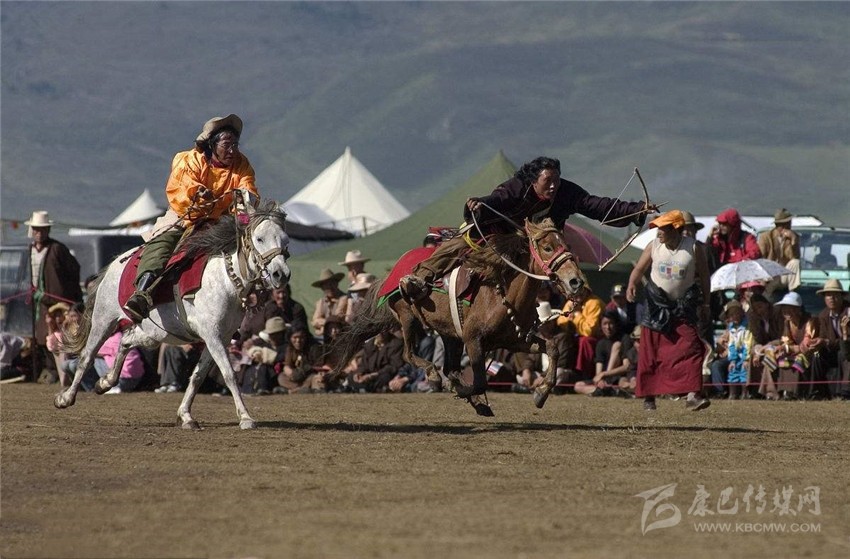 賽馬活動(dòng)中的分耐力賽、小走賽、馬術(shù)表演等,馬術(shù)表演有馬背倒立、飛馬射擊、馬肚藏身、俯身拾哈達(dá)等項(xiàng)目。驚險(xiǎn)刺激的賽馬,是充分展示藏區(qū)群眾健壯、靈巧和勇猛、膽大的一項(xiàng)活動(dòng),也是當(dāng)?shù)厍鄩涯瓯绕雌潴w魄、智慧和膽識(shí)的舞臺(tái),對(duì)年輕小伙兒來說,這還是一個(gè)捕獲心儀的姑娘的芳心的絕好時(shí)機(jī)。所以,在康巴地區(qū)的賽馬活動(dòng)始終都保持著精彩、激烈的特征。