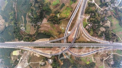 上午11時(shí)許,當(dāng)記者驅(qū)車到達(dá)對(duì)巖樞紐互通立交,用無(wú)人機(jī)從空中俯拍,這個(gè)縱橫交錯(cuò)、恢弘磅礴的交通樞紐,宛如盤(pán)旋在云端的銀龍,又似在大地上延伸的血脈,其造型、規(guī)模、結(jié)構(gòu)都令人嘆為觀止。