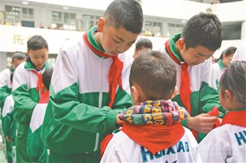 康定市回民小學(xué)六年級學(xué)生為新入隊學(xué)生佩戴紅領(lǐng)巾。