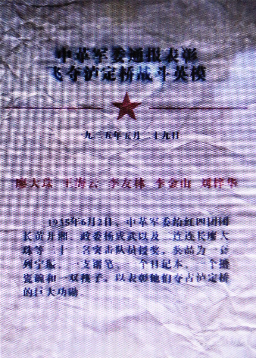劉東升談起父親當(dāng)年作為飛奪瀘定橋22勇士之一,心情無(wú)比激動(dòng)?!案赣H當(dāng)年如果不是努力爭(zhēng)取,就沒(méi)有后來(lái)的勇士稱號(hào),更沒(méi)有中革軍委的嘉獎(jiǎng)?!?935年5月,北上抗日的紅軍向天險(xiǎn)大渡河挺進(jìn)。大渡河水流湍急,兩岸都是高山峻嶺,只有一座鐵索橋可以通過(guò)。這座鐵索橋,就是紅軍北上必須奪取的瀘定橋。