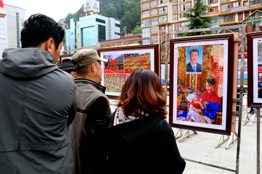 市民正在觀看“大美甘孜——慶祝中華人民共和國成立70周年攝影展“作品《趕上好時(shí)代》。