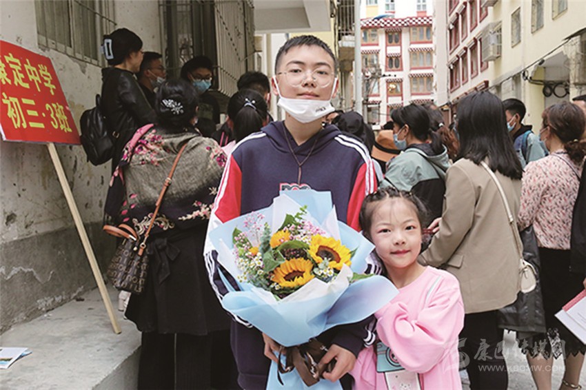 圖為妹妹為參加中考的哥哥獻上鮮花。