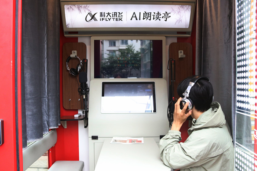 記者跟隨翟一川走進(jìn)亭子一看,亭內(nèi)配有專(zhuān)業(yè)的朗讀耳機(jī)、麥克風(fēng)、隔音氈、低噪聲渦輪新風(fēng)系統(tǒng)等設(shè)施,如同一個(gè)舒適的靜音艙。在這個(gè)專(zhuān)業(yè)的朗讀空間內(nèi),翟一川戴上耳機(jī),按照AI系統(tǒng)提示,認(rèn)真朗讀著屏幕上呈現(xiàn)的內(nèi)容。數(shù)十分鐘后,翟一川走出體驗(yàn)亭?!案鷮?zhuān)業(yè)的普通話測(cè)試一樣,測(cè)試結(jié)果直接在手機(jī)上可以看到,還標(biāo)注了音準(zhǔn)問(wèn)題,一個(gè)人就可以好好練習(xí)發(fā)音?!彼唤蚴烊恕鞍怖逼疬@個(gè)體驗(yàn)亭,引起不少過(guò)往路人關(guān)注。