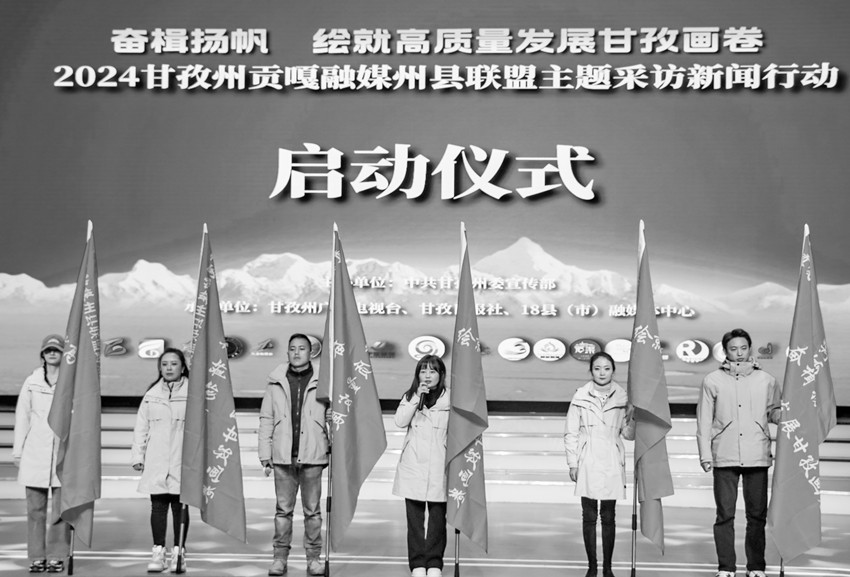 本網(wǎng)訊 為著力建設(shè)習(xí)近平文化思想涉藏地區(qū)生動(dòng)實(shí)踐地的“甘孜樣板”,奮力打造中華文明和康巴文化傳播的“甘孜窗口”,努力創(chuàng)造宣傳思想文化工作的“甘孜品牌”,2月28日,以“奮楫揚(yáng)帆 繪就高質(zhì)量發(fā)展甘孜畫卷”為主題的甘孜州貢嘎融媒州縣聯(lián)盟主題采訪新聞行動(dòng)在州廣播電視臺(tái)文藝演播大廳啟動(dòng),一場(chǎng)圍繞中心、服務(wù)大局的新聞實(shí)踐,分批推進(jìn)、貫穿全年的統(tǒng)一行動(dòng),新聞戰(zhàn)線協(xié)同聯(lián)動(dòng)、各展其長(zhǎng)的創(chuàng)新探索至此拉開(kāi)帷幕。