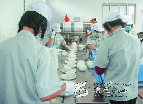 6、包裝。經(jīng)過消毒后的餐具被送到約2米長(zhǎng)的綠色傳送帶上,工人先用手把餐具按照包裝要求擺放好。之后送到包裝機(jī)器,用包裝膜封口包裝。