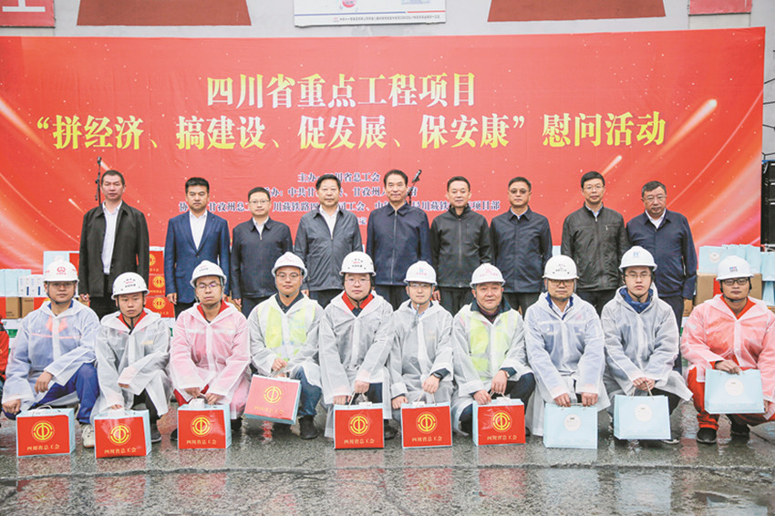 省委常委、統(tǒng)戰(zhàn)部長(zhǎng)趙俊民(左五),州委書記沈陽(yáng)(右四)等領(lǐng)導(dǎo)赴甘孜州重點(diǎn)工程項(xiàng)目開展“拼經(jīng)濟(jì)、促發(fā)展、保安康”慰問(wèn)活動(dòng)。