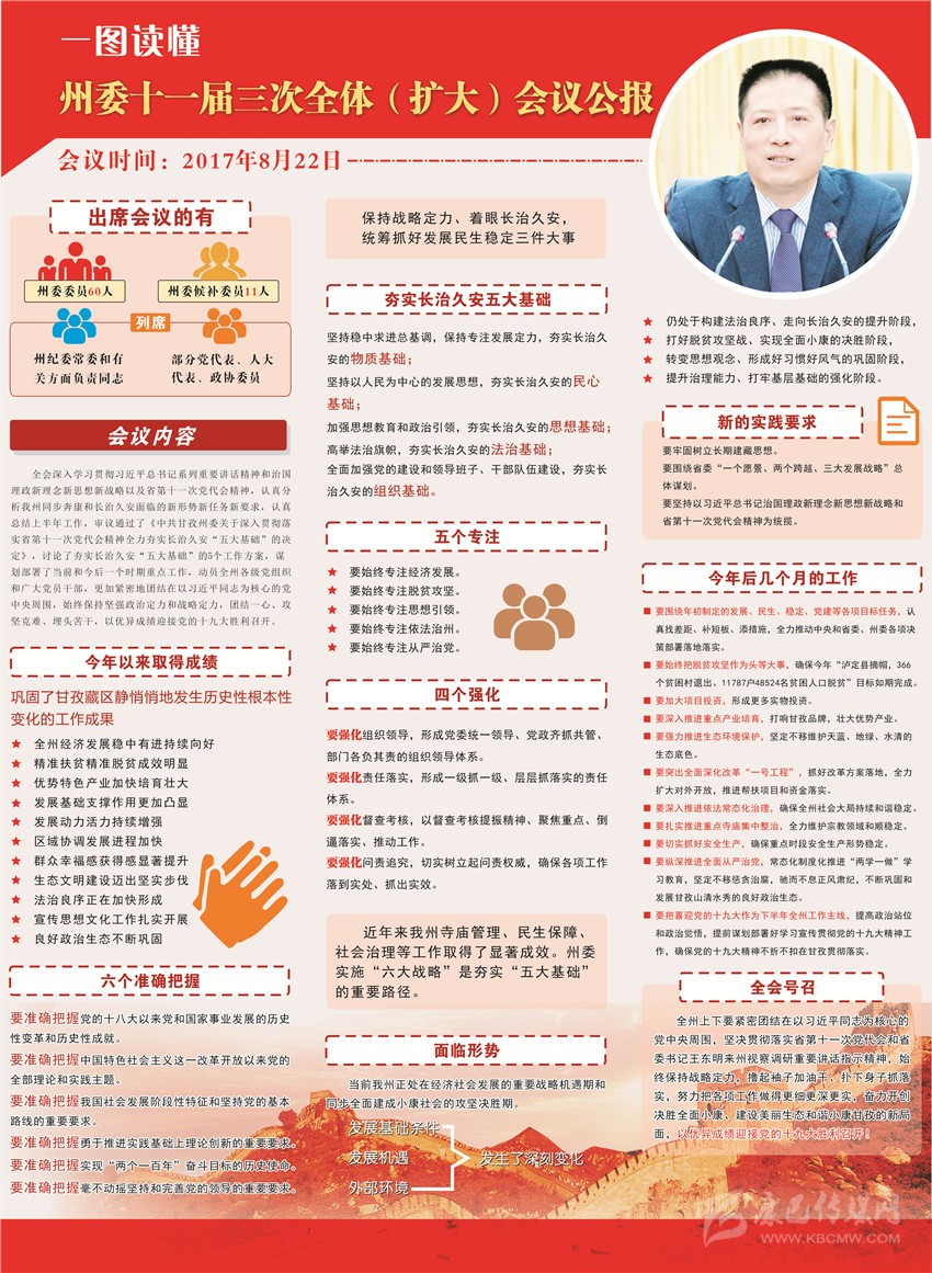 州委十一屆三次全體(擴大)會議審議通過了州委《關于深入貫徹落實省第十一次黨代會精神全力夯實長治久安“五大基礎”的決定》,向全州廣大黨員干部和各族群眾發(fā)出了“實施‘六大戰(zhàn)略’、夯實‘五大基礎’、確保長治久安”的進軍號令。“五大基礎”之間,緊密聯(lián)系、互為條件、相輔相成、相互牽動、相得益彰、缺一不可。在這“五大基礎”之中,全力夯實長治久安的物質(zhì)基礎,則是基礎中的基礎,顯得尤為重要和緊迫。