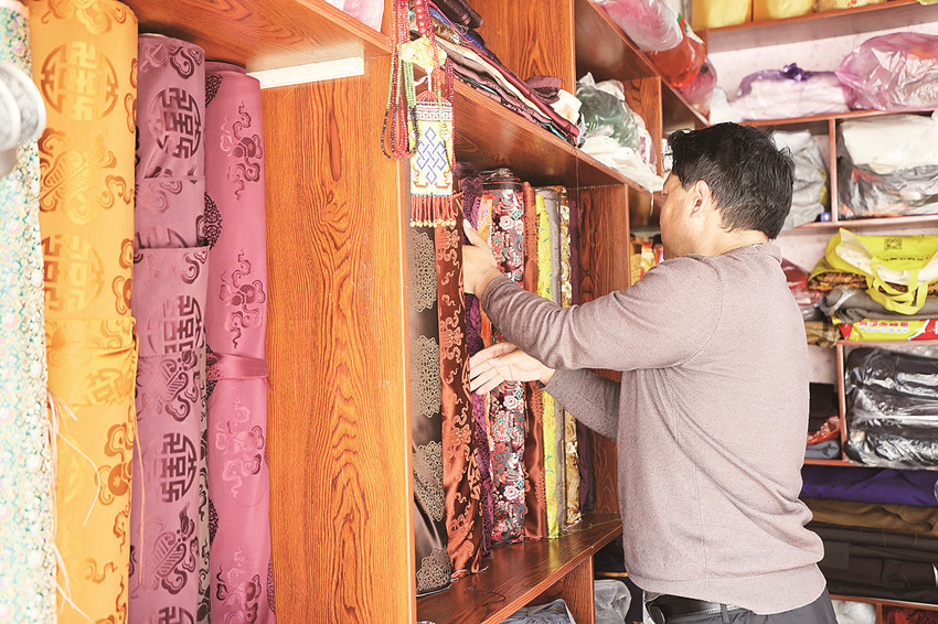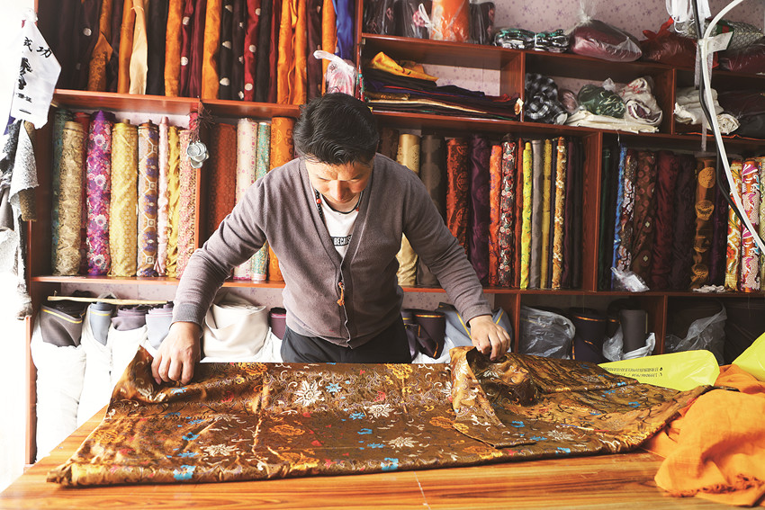 “傳統(tǒng)藏裝需要手工制作,青年、中年、老年人的款式各不一樣,料子也很有講究,還有裝飾也很重要……”說起登龍服飾,扎西澤仁神采飛揚(yáng),不時(shí)發(fā)出爽朗的笑聲,他說,“一般簡單的服裝制作僅需半天,復(fù)雜一些的要兩三天,價(jià)格從幾百元到幾千元不等?,F(xiàn)在縣城的商店生意很好,每天都能接到很多訂單,在登龍鄉(xiāng)的鋪?zhàn)咏唤o徒弟打理也完全沒有問題?!?/span>