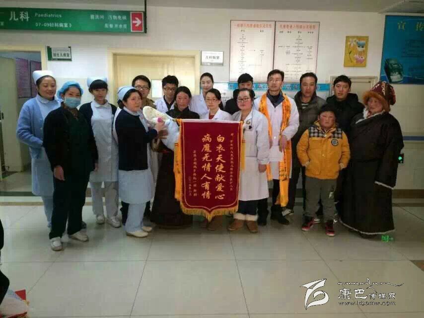 懷抱那胖乎乎、體重已經(jīng)增至2.9公斤的健康小寶寶,小家伙的母親雙眼流出了感激的淚花,她伸出大拇指,不停地“卡措、卡措(謝謝)”點頭致謝。為了表達感激之情,家人還特地送來了一面錦旗,上面印著“病魔無情人有情,白衣天使獻愛心”。