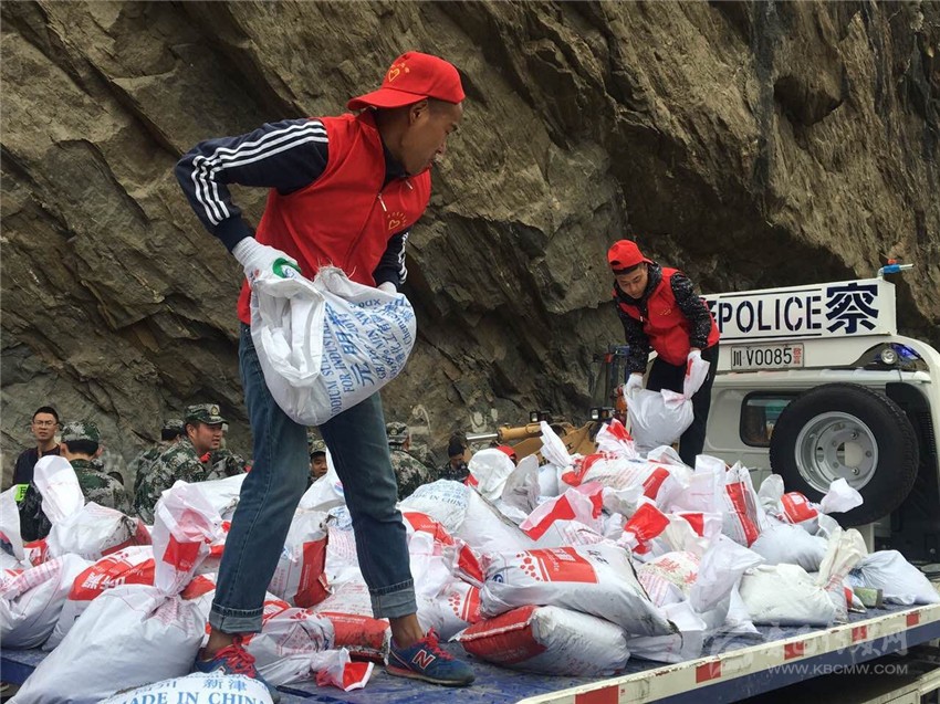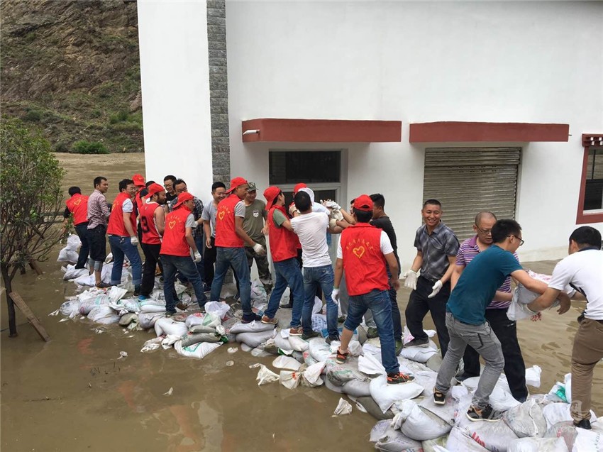 志愿者正在丹巴縣抗洪現(xiàn)場搬運(yùn)沙袋。