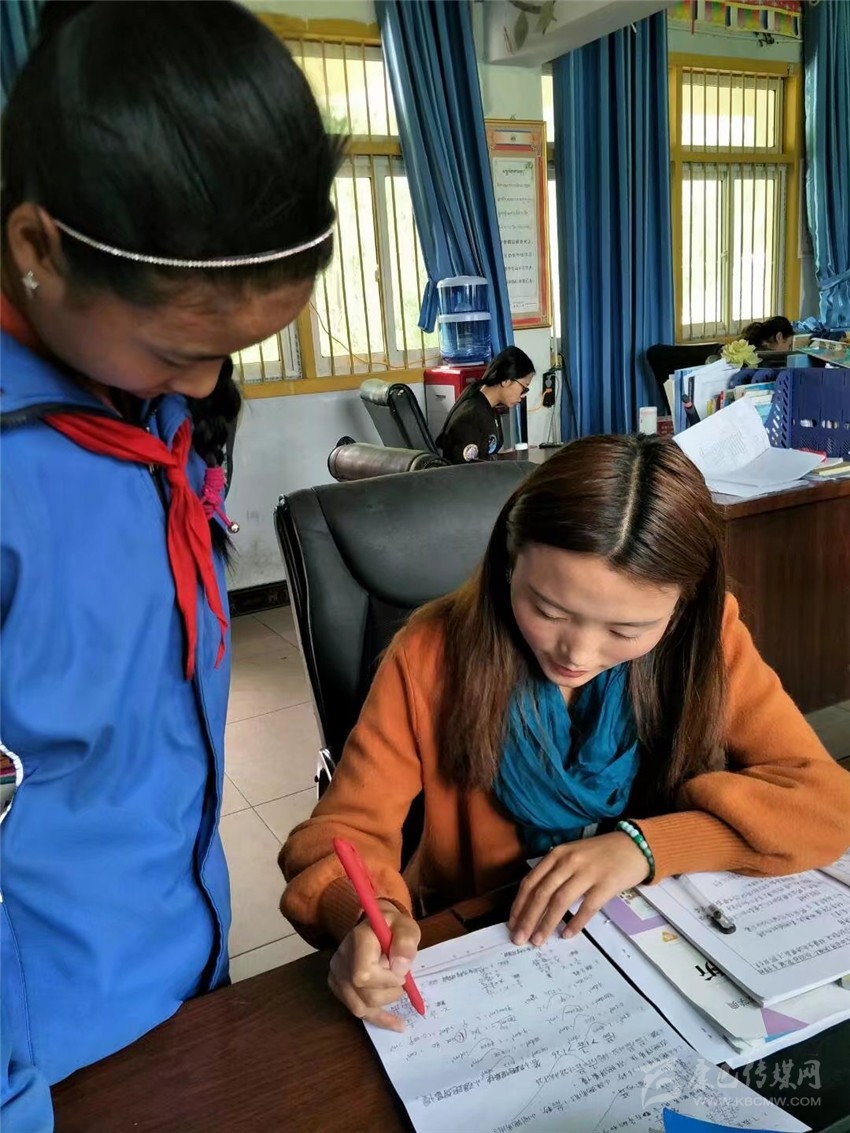 扎西拉姆正在輔導(dǎo)學(xué)生的作業(yè)。