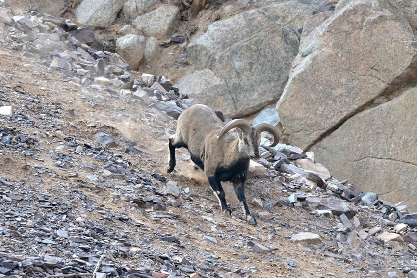 在回程的時(shí)候又看到一群巖羊,大約有20余只。這次與它們接近的距離僅有5、6米的地方。它們?cè)陉?duì)員們的面前若無(wú)其事地吃草,只有一只母羊抬頭看了隊(duì)員們一會(huì)兒。和這只母羊如此近距離接近,以至于能看清它的眼神里似乎只有一些疑惑,卻沒(méi)有恐懼。