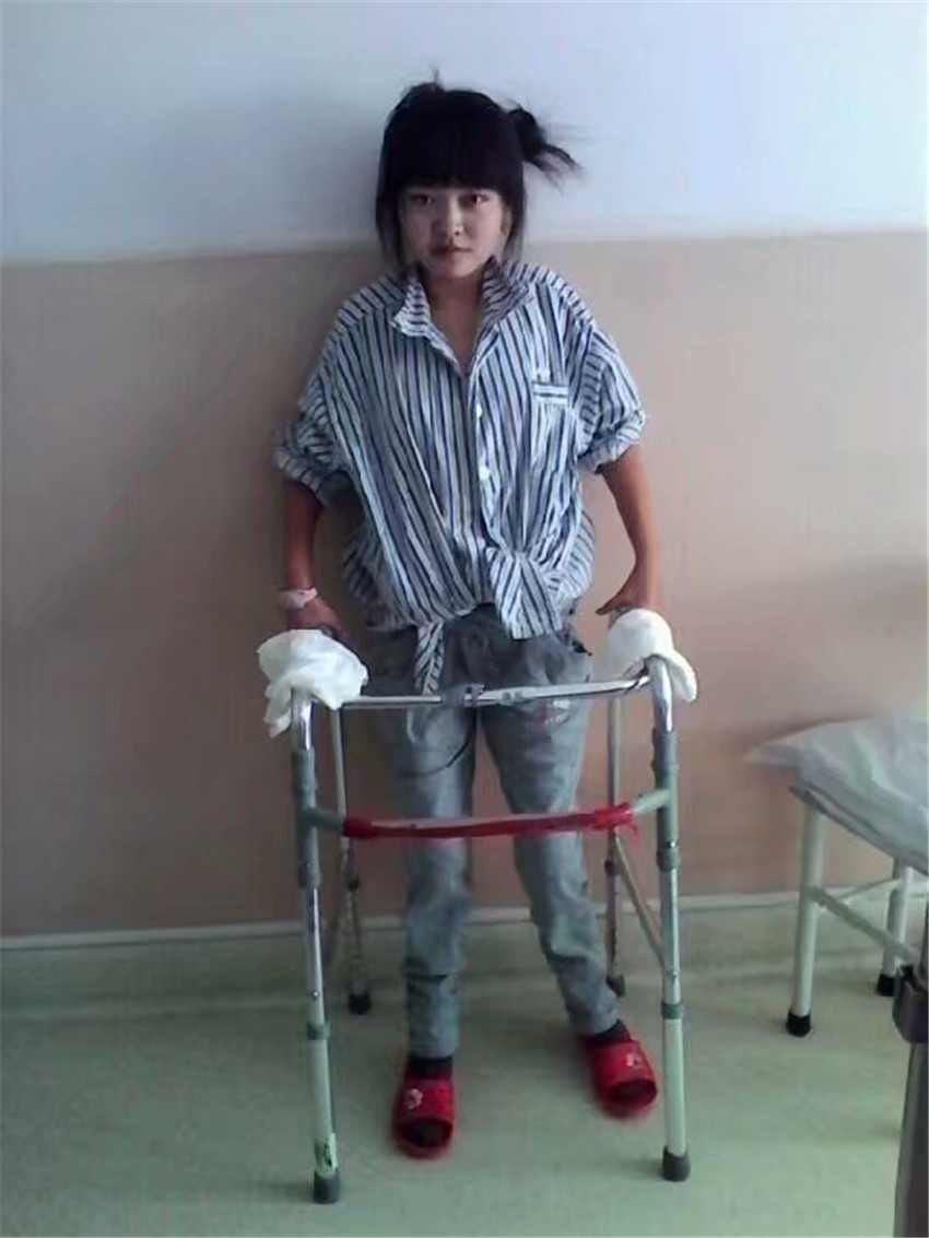 23歲時(shí),深圳的楊先生爽快地幫助朱靈湊夠了手術(shù)費(fèi)用。2013年9月,朱靈在親人的護(hù)送下,到北京接受了手術(shù)治療,手術(shù)很成功。但做牽引、吊腿、揉搓、重壓等康復(fù)訓(xùn)練,如遭酷刑,萬般痛苦,她曾想放棄。在病友和親屬的鼓勵(lì)下,她倚墻靠壁,憑借器具,大汗淋漓,通過一個(gè)多月的康復(fù)鍛煉,朱靈終于站了起來。