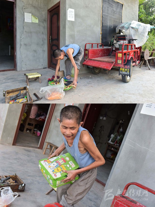 “周強善曾是全鄉(xiāng)最困難的貧困戶?!敝行泥l(xiāng)黨委書記楊壘說,周強善的妻子在剛生下女兒后因病去世。2005年,他在外務(wù)工時右腿受傷,留下殘疾。后來他自學(xué)補鞋技術(shù),成了一名鞋匠,但腿腳不便、下山路不通,三娃多年“悶”在家里。