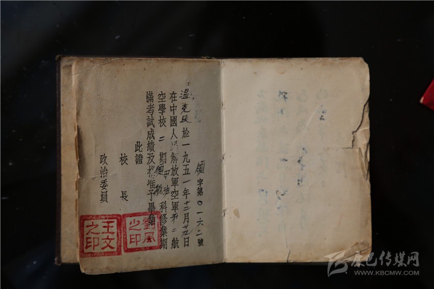 溫克棟的大兒子、57歲的溫樹平拿出大伯留下的遺物——一本中國(guó)人民解放軍航空學(xué)校畢業(yè)證書、一本中國(guó)人民解放軍空軍后勤部發(fā)的飛行裝具證、一本《中國(guó)共產(chǎn)黨黨章》、一本《中國(guó)人民政治協(xié)商會(huì)議共同綱領(lǐng)》,四本珍貴的文物書頁發(fā)黃,有的還有些微殘缺,但卻是珍貴的歷史見證物,溫家視為傳家寶。