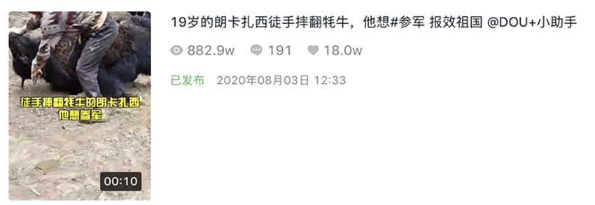 8月3日,這段僅有10秒長的視頻,在抖音短視頻平臺《甘孜日報》康巴傳媒抖音號發(fā)布后,短短一天內獲得了800多萬次播放量,200多名網友留言評論,18萬次點贊更是“宣告”其正式成為“網絡爆款”。