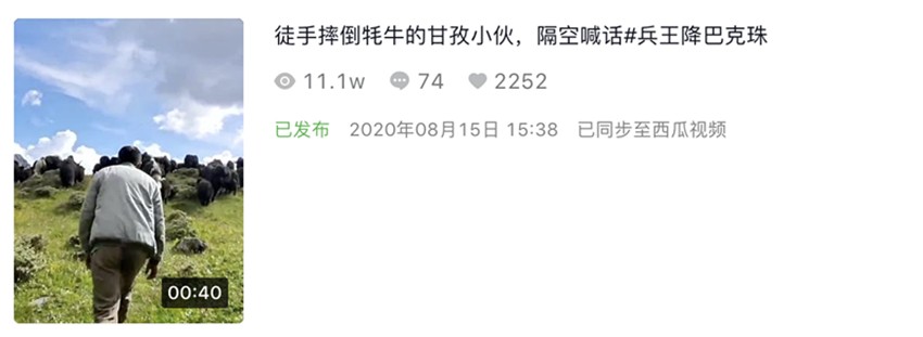 8月15日,一段時長30秒的視頻出現(xiàn)在抖音平臺中,郎卡扎西用并不標準的普通話向網友們介紹了自己,他趕著牦牛上山、摔倒牦牛、和朋友們打籃球的畫面依次展現(xiàn),視頻最后他面對鏡頭再次說出了自己的心聲:“要成為像降巴克珠哥哥那樣的軍人!”