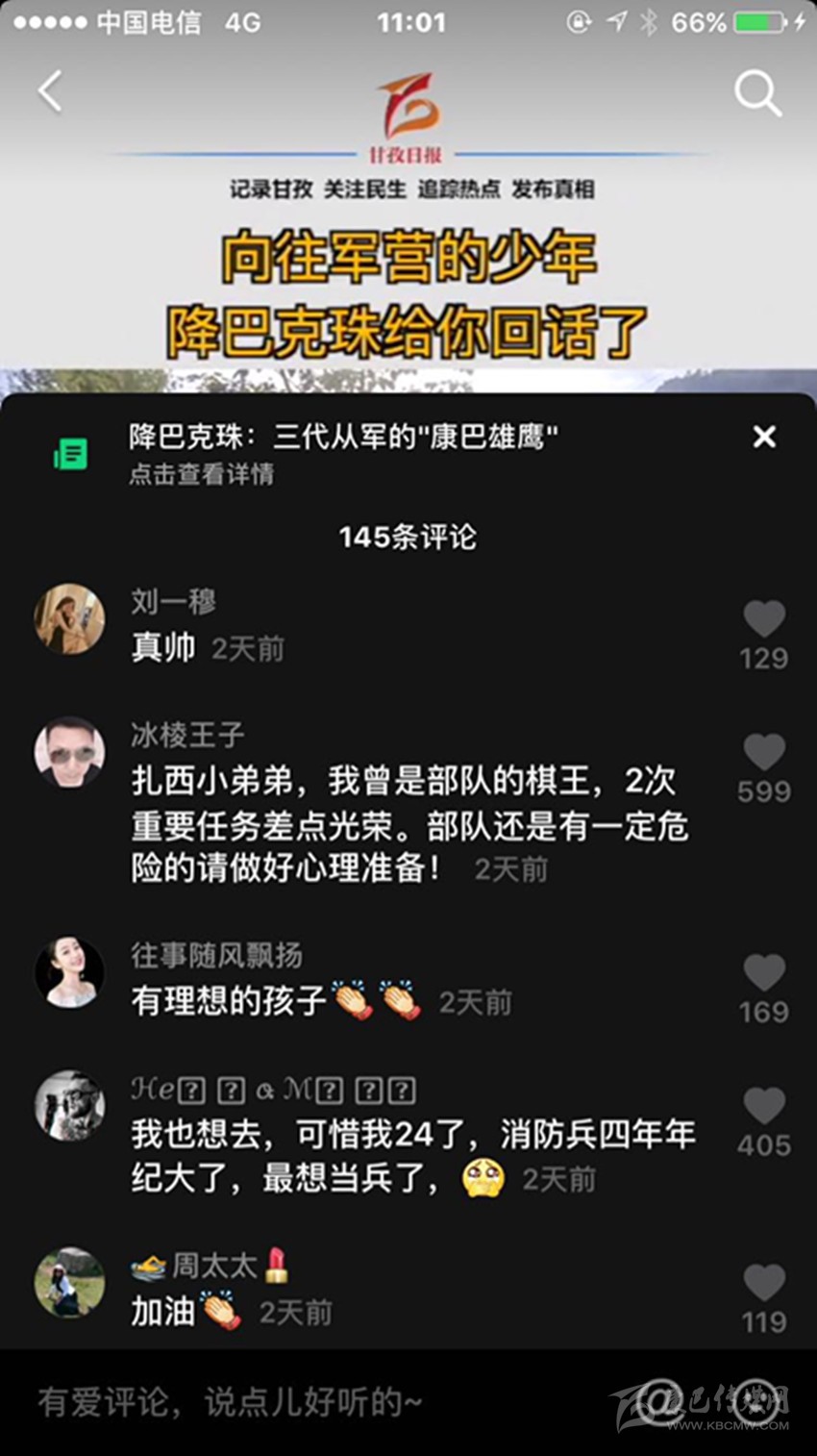 三段視頻,六百多條留言,近兩千萬次播放,一個藏族少年的軍旅夢在網絡上熱烈綻放,而農牧區(qū)許多青年的軍旅夢也就此被點燃,忠勇大愛的“血脈”在康巴高原傳承! (本網記者 肖宵 整理)