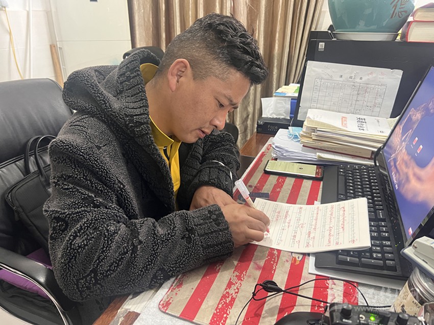 “尼瑪老師不僅對學(xué)生的學(xué)習(xí)生活關(guān)懷備至,作為任課教師,我們常??吹剿谛菹r(shí)間認(rèn)真?zhèn)湔n。他會聲情并茂地大聲誦讀精心準(zhǔn)備的課件,大家都覺得很有趣,學(xué)生學(xué)習(xí)的積極性也提高了。他批改作業(yè)也非常認(rèn)真,給每一位同學(xué)寫的評語都用心用情。他是真的是用全部身心來對待工作,不愧是一名優(yōu)秀的老師?!辈稍L過程中,筆者偶遇了援建教師廖俊希,談起對章拉尼瑪?shù)挠∠?,廖俊希的評價(jià)細(xì)致而中肯。