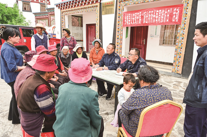 純白的藏房,被黃綠交錯(cuò)的梯田簇?fù)碇筷赝高^(guò)薄霧,灑向山坳,勤勞的村民在田間勞作,眼前是一副如詩(shī)如畫(huà)的香巴拉風(fēng)光。平安是最美的風(fēng)景,在這田園牧歌般的美景背后,鄉(xiāng)城縣公安局的衛(wèi)士們以實(shí)際行動(dòng)勾畫(huà)出一幅守護(hù)一方平安的“警民和諧圖”。