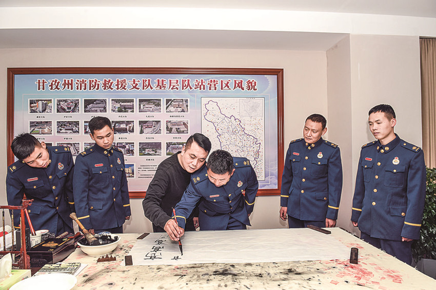 此次活動,該支隊邀請到中華文化研究院院士、中國書畫家聯(lián)誼會理事、中國行為法學會廉政書畫院四川分院院長、中國女子書畫院成都分院副院長、四川省毛體書法家協(xié)會理事劉源和中國詩書畫院書法研究院黃子夫為消防救援人員們展紙揮毫,于書法中弘揚優(yōu)秀傳統(tǒng)文化,于文學中謳歌新時代精神,于筆韻中傳播消防安全正能量。