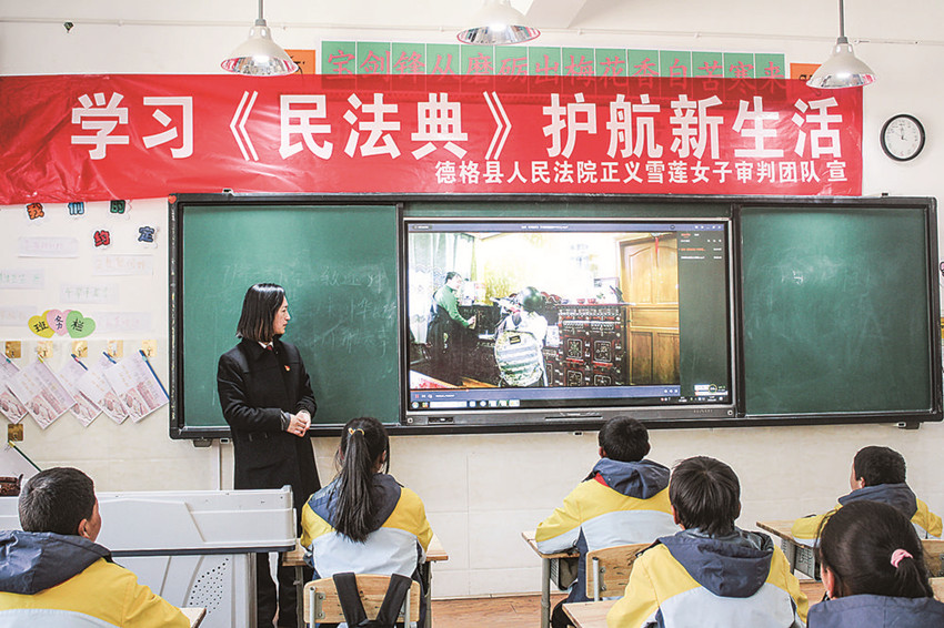 “正義雪蓮”女子審判團隊堅持司法為民、普法在前,主動聯(lián)合縣婦聯(lián)、民政部門、教育系統(tǒng)、新聞媒體等,送法進鄉(xiāng)村、進社區(qū)、進家庭、進校園,積極開展形式多樣的法治宣傳工作,著力提升婦女、兒童的維權(quán)意識。尤其在重要節(jié)假日,針對不同群體,團隊成員還專門準備不同的宣講內(nèi)容,提高普法供給的精準性和有效性。在婦女節(jié),攜手德格縣婦聯(lián)走進社區(qū)開展《民法典》婚姻家庭篇專題講座,結(jié)合在調(diào)解、審判過程中涉及到的財產(chǎn)保護等家事案件進行分析普法,使廣大婦女掌握更多涉及婚姻家庭的法律知識,從而更好地保護自己的合法權(quán)益。在重陽節(jié),到縣關(guān)工委講授《民法典》涉未成年人保護專題講座。在中小學(xué)校設(shè)立法治副校長,掛牌設(shè)立“正義雪蓮”法律服務(wù)站,通過到學(xué)校上法治教育課,使學(xué)生了解到不同年齡階段需要承擔的法律責任,增強他們明辨是非和自我保護的能力,并邀請學(xué)生參觀法院、參加模擬法庭等,讓學(xué)生零距離接觸司法審判工作,用法治之光照亮青少年成長之路。
