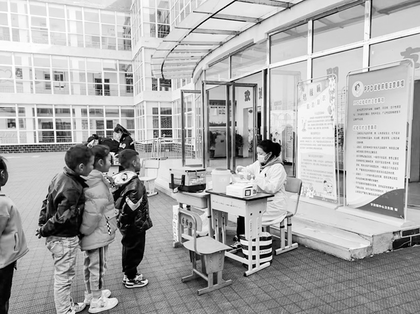 圖為醫(yī)護人員到學校開展預(yù)防接種工作。