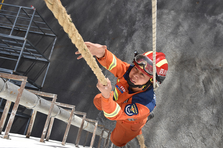 危急時刻,姜鵬和隊(duì)友迅速開展救援行動。姜鵬在做好個人防護(hù)后,立即將救生繩索拴在腰上,從10余米高處一躍而下,利用繩索迅速下降,快速地將被困女子固定住,成功將女子救出。