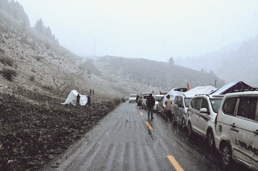 然而,高原的天、娃娃的臉,說變就變。剛剛還艷陽高照的晴好天氣,瞬間寒風四起,鵝毛大雪不一會便覆蓋了整個山野。由于到達蟲草采集點還需4、50分鐘人力轉(zhuǎn)運物資,受天氣影響,前行受阻,擔任護送任務(wù)的民輔警當即幫助群眾搭建臨時安置點,風雪中警民互助的身影像極了一家人。一切收拾停當,盡管風寒雪大,條件艱辛,樂觀的群眾和伴隨服務(wù)的民輔警還不忘在風雪中來一張合照,他們說,這是歷年來的慣例,每次上山采集蟲草和下山返程,他們都會一個不少地拍張“全家福”,以此留念蟲草季警民相依的美好記憶。