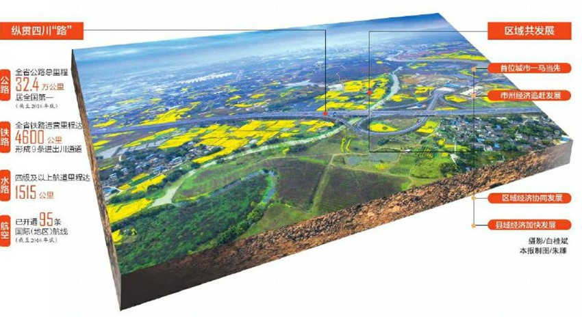 截至2016年底,全省公路總里程32.4萬公里,居全國第一;過去4年新改擴建農(nóng)村公路近10萬公里,居全國第一;高速公路通車6519公里,居全國第二,較2012年底提升5個位次;四級及以上航道里程達1515公里,較2012年增加500公里,港口集裝箱吞吐能力達233萬標箱,建成19條公路水路進出川大通道。