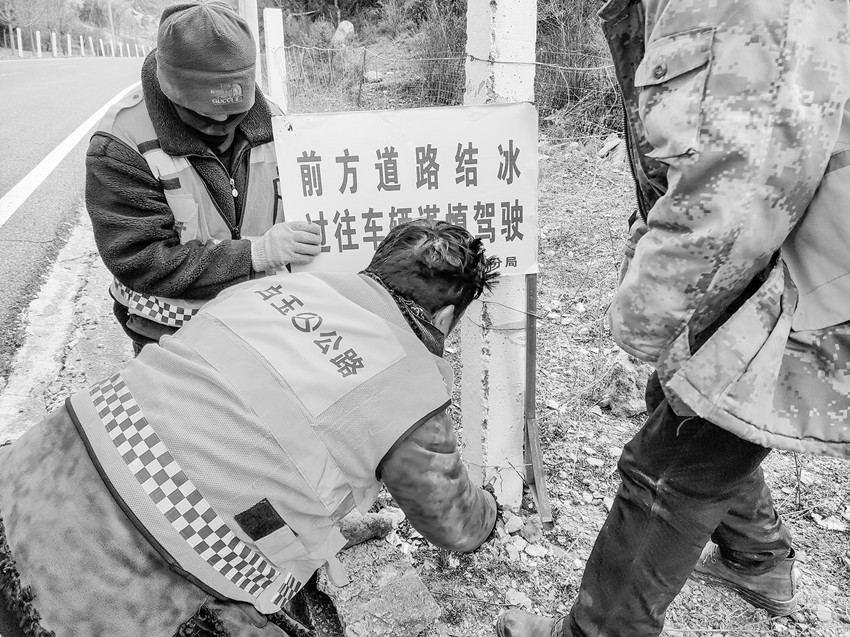 冬季氣溫下降,在夜晚形成結(jié)冰現(xiàn)象,易造成汽車打滑,難以控制,對(duì)過(guò)往車輛安全造成極大威脅。白玉公路分局出動(dòng)人員 450 人、 車輛72輛次,對(duì)管養(yǎng)轄區(qū)道路全線進(jìn)行警示牌的安裝。同時(shí),對(duì)有暗冰、陰山積雪等路段及時(shí)拋灑防滑沙和融雪劑,確保道路行駛安全。